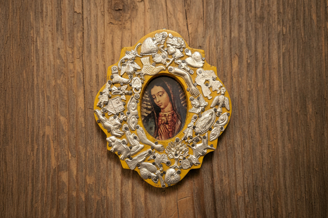 Wooden Medallion with Milagros featuring the Sacred Heart